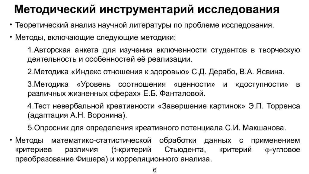 Теоретический анализ научной литературы по проблеме исследования. Методы, включающие следующие методики: Авторская анкета для изучения включенности студентов в творческую деятельность и особенностей её реализации. Методика «Индекс отношения к здоровью» С.Д. Дерябо, В.А. Ясвина. Методика «Уровень соотношения «ценности» и «доступности» в различных жизненных сферах» Е.Б. Фанталовой. Тест невербальной креативности «Завершение картинок» Э.П. Торренса (адаптация А.Н. Воронина). Опросник для определения креативного потенциала С.И. Макшанова. Методы математико-статистической обработки данных с применением критериев различия (t-критерий Стьюдента, критерий - угловое преобразование Фишера) и корреляционного анализа. 6