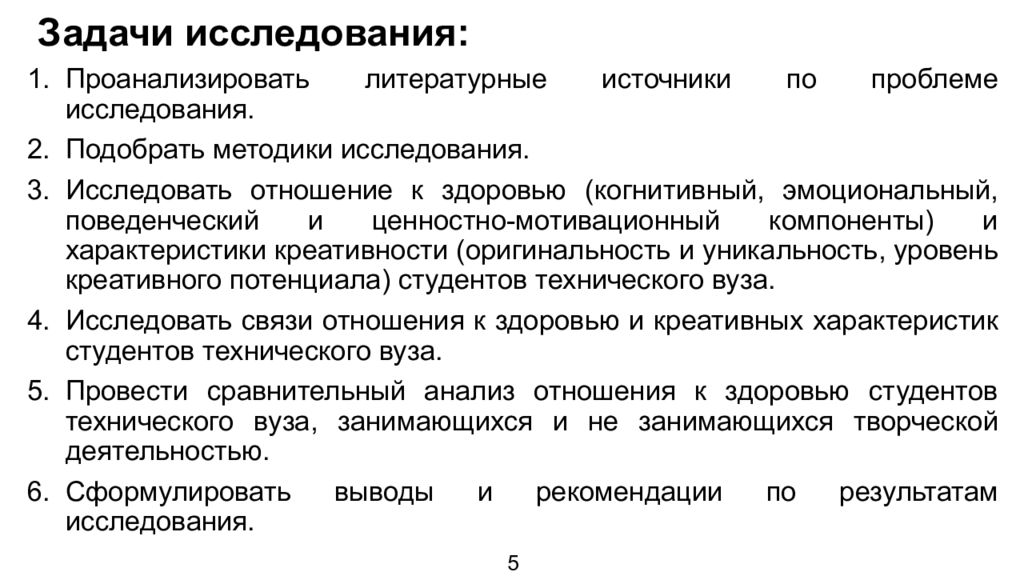 Проанализировать литературные источники по проблеме исследования. Подобрать методики исследования. Исследовать отношение к здоровью (когнитивный, эмоциональный, поведенческий и ценностно-мотивационный компоненты) и характеристики креативности (оригинальность и уникальность, уровень креативного потенциала) студентов технического вуза. Исследовать связи отношения к здоровью и креативных характеристик студентов технического вуза. Провести сравнительный анализ отношения к здоровью студентов технического вуза, занимающихся и не занимающихся творческой деятельностью. Сформулировать выводы и рекомендации по результатам исследования. 5