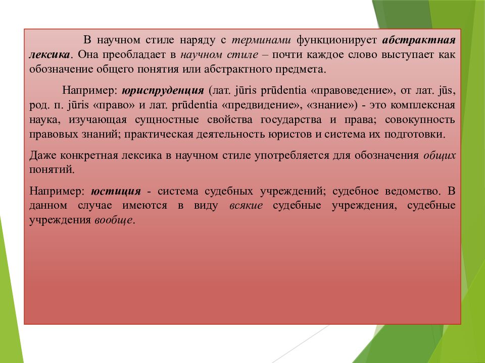 В научном стиле наряду с терминами функционирует абстрактная лексика. Она преобладает в научном стиле – почти каждое слово выступает как обозначение общего понятия или абстрактного предмета. Например: юриспруденция (лат. jūris prūdentia «правоведение», от лат. jūs, род. п. jūris «право» и лат. prūdentia «предвидение», «знание») - это комплексная наука, изучающая сущностные свойства государства и права; совокупность правовых знаний; практическая деятельность юристов и система их подготовки. Даже конкретная лексика в научном стиле употребляется для обозначения общих понятий. Например: юстиция - система судебных учреждений; судебное ведомство. В данном случае имеются в виду всякие судебные учреждения, судебные учреждения вообще.