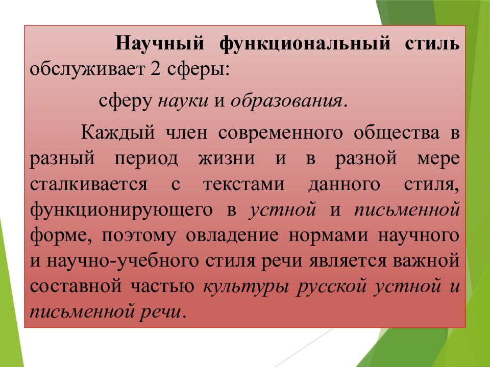 Научный функциональный стиль обслуживает 2 сферы: сферу науки и образования. Каждый член современного общества в разный период жизни и в разной мере сталкивается с текстами данного стиля, функционирующего в устной и письменной форме, поэтому овладение нормами научного и научно-учебного стиля речи является важной составной частью культуры русской устной и письменной речи.