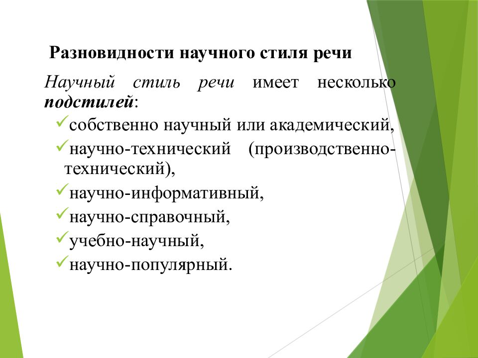 Разновидности научного стиля речи Научный стиль речи имеет несколько подстилей : собственно научный или академический, научно-технический (производственно-технический), научно-информативный, научно-справочный, учебно-научный, научно-популярный.