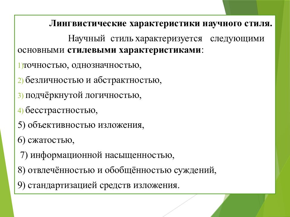 Лингвистические характеристики научного стиля. Научный стиль характеризуется следующими основными стилевыми характеристиками : точностью, однозначностью, безличностью и абстрактностью, подчёркнутой логичностью, бесстрастностью, 5) объективностью изложения, 6) сжатостью, 7) информационной насыщенностью, 8) отвлечённостью и обобщённостью суждений, 9) стандартизацией средств изложения.