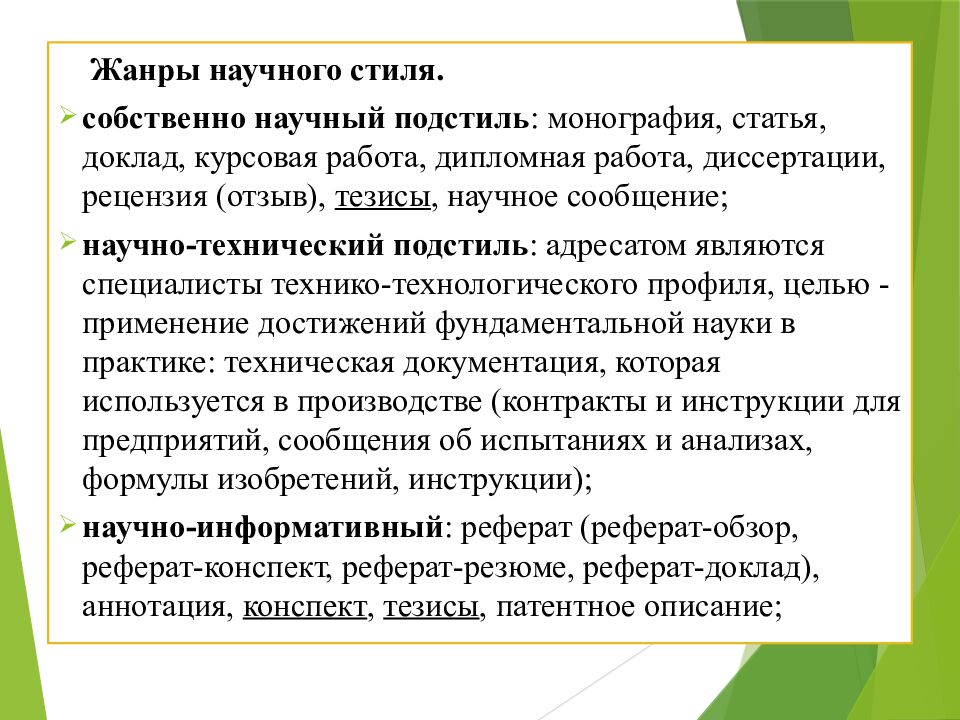 Жанры научного стиля. собственно научный подстиль : монография, статья, доклад, курсовая работа, дипломная работа, диссертации, рецензия (отзыв), тезисы, научное сообщение; научно-технический подстиль : адресатом являются специалисты технико-технологического профиля, целью - применение достижений фундаментальной науки в практике: техническая документация, которая используется в производстве (контракты и инструкции для предприятий, сообщения об испытаниях и анализах, формулы изобретений, инструкции); научно-информативный : реферат (реферат-обзор, реферат-конспект, реферат-резюме, реферат-доклад), аннотация, конспект, тезисы, патентное описание;