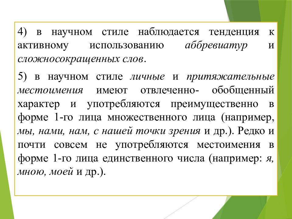 4) в научном стиле наблюдается тенденция к активному использованию аббревиатур и сложносокращенных слов. 5) в научном стиле личные и притяжательные местоимения имеют отвлеченно - обобщенный характер и употребляются преимущественно в форме 1-го лица множественного лица (например, мы, нами, нам, с нашей точки зрения и др.). Редко и почти совсем не употребляются местоимения в форме 1-го лица единственного числа (например: я, мною, моей и др.).