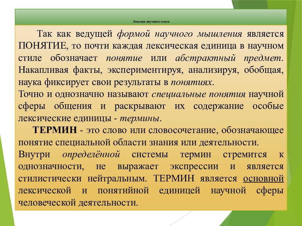 Так как ведущей формой научного мышления является ПОНЯТИЕ, то почти каждая лексическая единица в научном стиле обозначает понятие или абстрактный предмет. Накапливая факты, экспериментируя, анализируя, обобщая, наука фиксирует свои результаты в понятиях. Точно и однозначно называют специальные понятия научной сферы общения и раскрывают их содержание особые лексические единицы - термины. ТЕРМИН - это слово или словосочетание, обозначающее понятие специальной области знания или деятельности. Внутри определённой системы термин стремится к однозначности, не выражает экспрессии и является стилистически нейтральным. ТЕРМИН является основной лексической и понятийной единицей научной сферы человеческой деятельности.