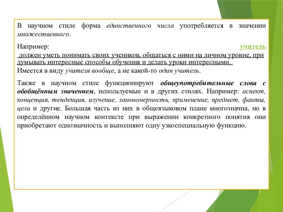 В научном стиле форма единственного числа употребляется в значении множественного. Например: учитель должен уметь понимать своих учеников, общаться с ними на личном уровне, придумывать интересные способы обучения и делать уроки интересными. Имеется в виду учителя вообще, а не какой-то один учитель. Также в научном стиле функционируют общеупотребительные слова с обобщённым значением, используемые и в других стилях. Например: аспект, концепция, тенденция, изучение, закономерность, применение, предмет, факты, цели и другие. Большая часть из них в общеязыковом плане многозначна, но в определённом научном контексте при выражении конкретного понятия они приобретают однозначность и выполняют одну узкоспециальную функцию.