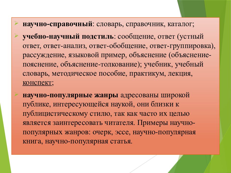 научно-справочный : словарь, справочник, каталог; учебно-научный подстиль : сообщение, ответ (устный ответ, ответ-анализ, ответ-обобщение, ответ-группировка), рассуждение, языковой пример, объяснение (объяснение-пояснение, объяснение-толкование); учебник, учебный словарь, методическое пособие, практикум, лекция, конспект ; научно-популярные жанры адресованы широкой публике, интересующейся наукой, они близки к публицистическому стилю, так как часто их целью является заинтересовать читателя. Примеры научно-популярных жанров: очерк, эссе, научно-популярная книга, научно-популярная статья.