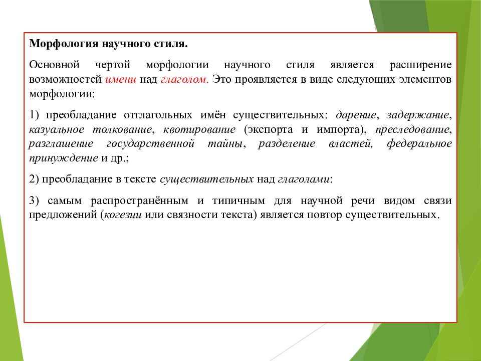 Морфология научного стиля. Основной чертой морфологии научного стиля является расширение возможностей имени над глаголом. Это проявляется в виде следующих элементов морфологии: 1) преобладание отглагольных имён существительных: дарение, задержание, казуальное толкование, квотирование (экспорта и импорта), преследование, разглашение государственной тайны, разделение властей, федеральное принуждение и др.; 2) преобладание в тексте существительных над глаголами : 3) самым распространённым и типичным для научной речи видом связи предложений ( когезии или связности текста) является повтор существительных.