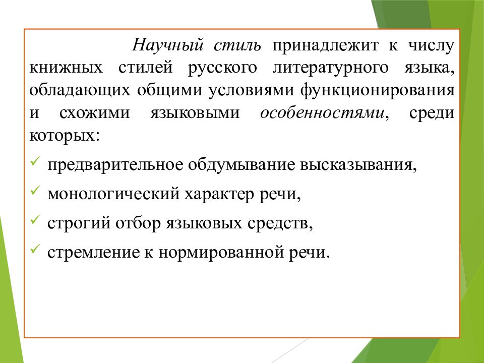 Научный стиль принадлежит к числу книжных стилей русского литературного языка, обладающих общими условиями функционирования и схожими языковыми особенностями, среди которых: предварительное обдумывание высказывания, монологический характер речи, строгий отбор языковых средств, стремление к нормированной речи.
