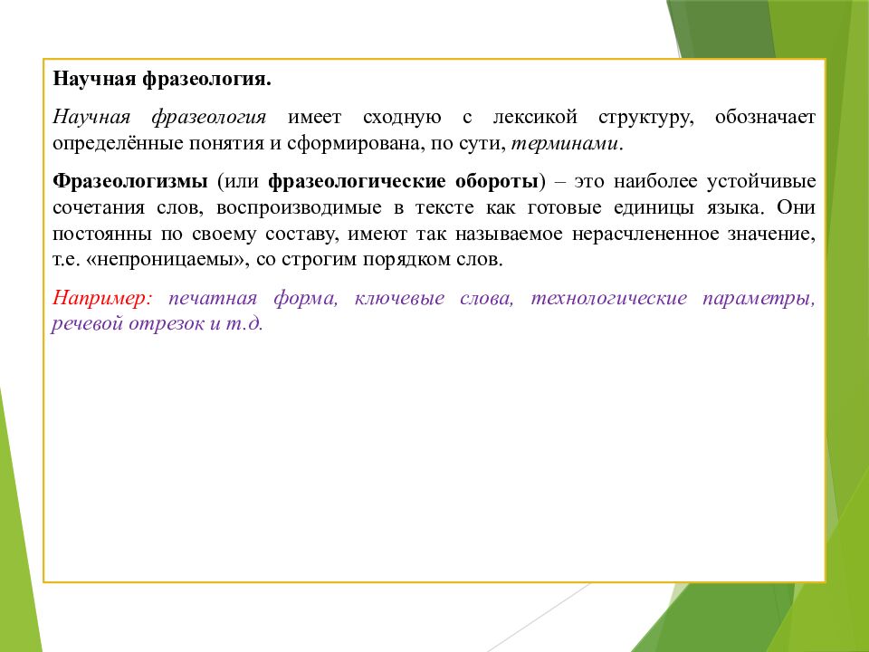 Научная фразеология. Научная фразеология имеет сходную с лексикой структуру, обозначает определённые понятия и сформирована, по сути, терминами. Фразеологизмы (или фразеологические обороты ) – это наиболее устойчивые сочетания слов, воспроизводимые в тексте как готовые единицы языка. Они постоянны по своему составу, имеют так называемое нерасчлененное значение, т.е. «непроницаемы», со строгим порядком слов. Например: печатная форма, ключевые слова, технологические параметры, речевой отрезок и т.д.