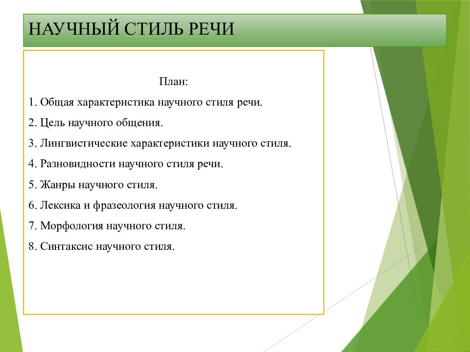 План: 1. Общая характеристика научного стиля речи. 2. Цель научного общения. 3. Лингвистические характеристики научного стиля. 4. Разновидности научного стиля речи. 5. Жанры научного стиля. 6. Лексика и фразеология научного стиля. 7. Морфология научного стиля. 8. Синтаксис научного стиля.