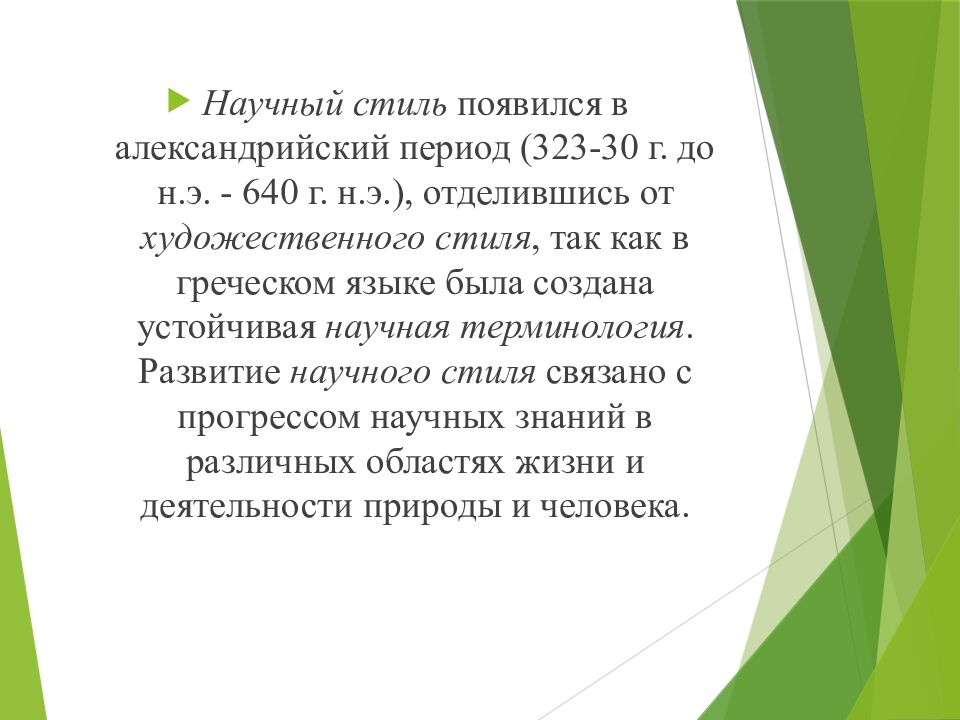 Научный стиль появился в александрийский период (323-30 г. до н.э. - 640 г. н.э.), отделившись от художественного стиля, так как в греческом языке была создана устойчивая научная терминология. Развитие научного стиля связано с прогрессом научных знаний в различных областях жизни и деятельности природы и человека.
