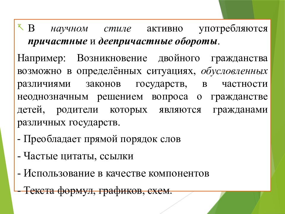 В научном стиле активно употребляются причастные и деепричастные обороты. Например: Возникновение двойного гражданства возможно в определённых ситуациях, обусловленных различиями законов государств, в частности неоднозначным решением вопроса о гражданстве детей, родители которых являются гражданами различных государств. - Преобладает прямой порядок слов - Частые цитаты, ссылки - Использование в качестве компонентов - Текста формул, графиков, схем.