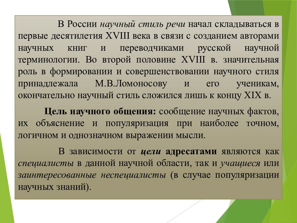 В России научный стиль речи начал складываться в первые десятилетия XVIII века в связи с созданием авторами научных книг и переводчиками русской научной терминологии. Во второй половине XVIII в. значительная роль в формировании и совершенствовании научного стиля принадлежала М.В.Ломоносову и его ученикам, окончательно научный стиль сложился лишь к концу XIX в. Цель научного общения: сообщение научных фактов, их объяснение и популяризация при наиболее точном, логичном и однозначном выражении мысли. В зависимости от цели адресатами являются как специалисты в данной научной области, так и учащиеся или заинтересованные неспециалисты (в случае популяризации научных знаний).