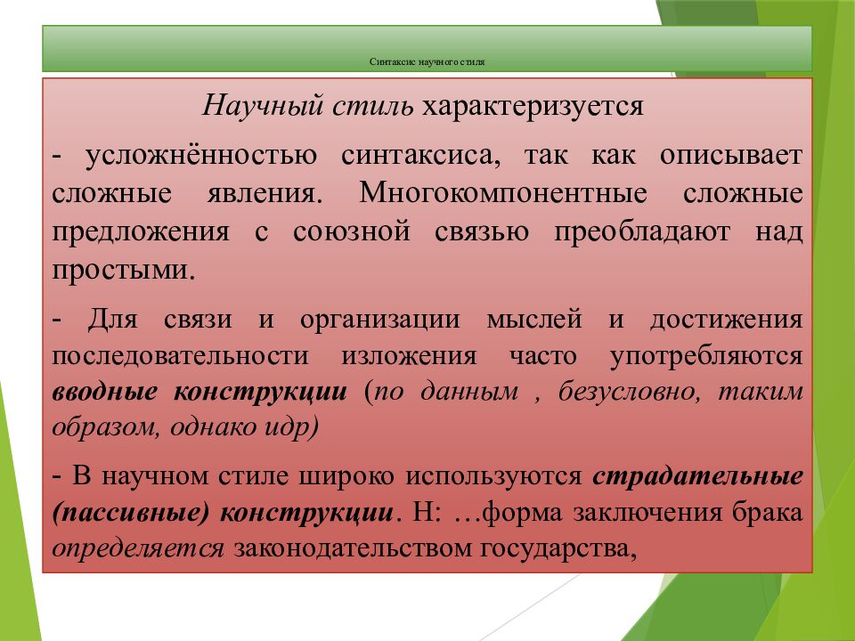 Научный стиль характеризуется - усложнённостью синтаксиса, так как описывает сложные явления. Многокомпонентные сложные предложения с союзной связью преобладают над простыми. - Для связи и организации мыслей и достижения последовательности изложения часто употребляются вводные конструкции ( по данным, безусловно, таким образом, однако идр ) - В научном стиле широко используются страдательные (пассивные) конструкции. Н: …форма заключения брака определяется законодательством государства,