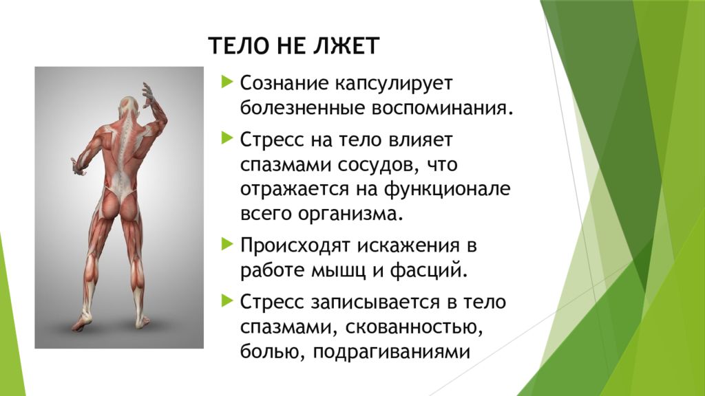 Сознание капсулирует болезненные воспоминания. Стресс на тело влияет спазмами сосудов, что отражается на функционале всего организма. Происходят искажения в работе мышц и фасций. Стресс записывается в тело спазмами, скованностью, болью, подрагиваниями