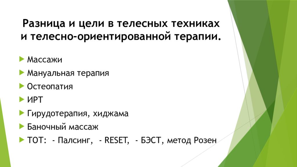 Слайд 2: Разница и цели в телесных техниках и телесно-ориентированной терапии