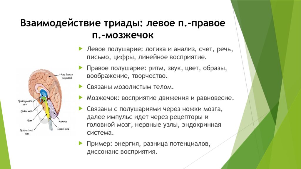 Слайд 6: Взаимодействие триады: левое п.-правое п.-мозжечок