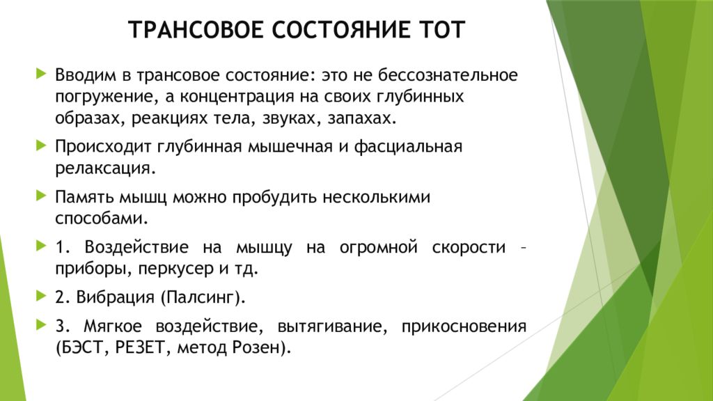 Вводим в трансовое состояние: это не бессознательное погружение, а концентрация на своих глубинных образах, реакциях тела, звуках, запахах. Происходит глубинная мышечная и фасциальная релаксация. Память мышц можно пробудить несколькими способами. 1. Воздействие на мышцу на огромной скорости – приборы, перкусер и тд. 2. Вибрация ( Палсинг ). 3. Мягкое воздействие, вытягивание, прикосновения (БЭСТ, РЕЗЕТ, метод Розен).