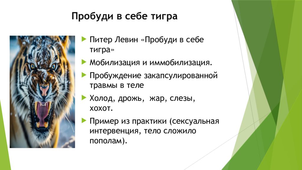 Питер Левин «Пробуди в себе тигра» Мобилизация и иммобилизация. Пробуждение закапсулированной травмы в теле Холод, дрожь, жар, слезы, хохот. Пример из практики (сексуальная интервенция, тело сложило пополам).