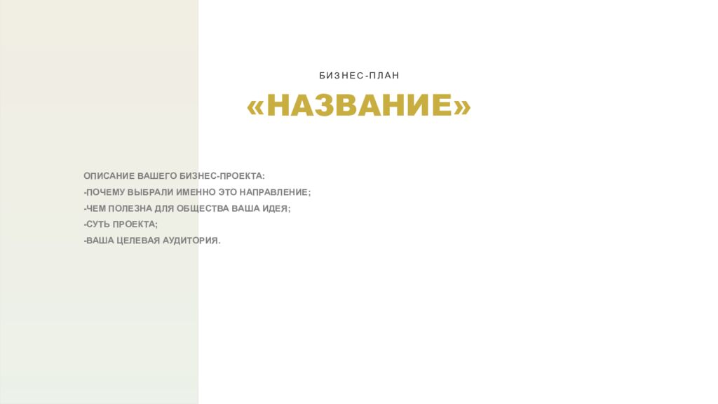 ОПИСАНИЕ ВАШЕГО БИЗНЕС-ПРОЕКТА: -ПОЧЕМУ ВЫБРАЛИ ИМЕННО ЭТО НАПРАВЛЕНИЕ; -ЧЕМ ПОЛЕЗНА ДЛЯ ОБЩЕСТВА ВАША ИДЕЯ; -СУТЬ ПРОЕКТА; -ВАША ЦЕЛЕВАЯ АУДИТОРИЯ. «НАЗВАНИЕ» БИЗНЕС-ПЛАН