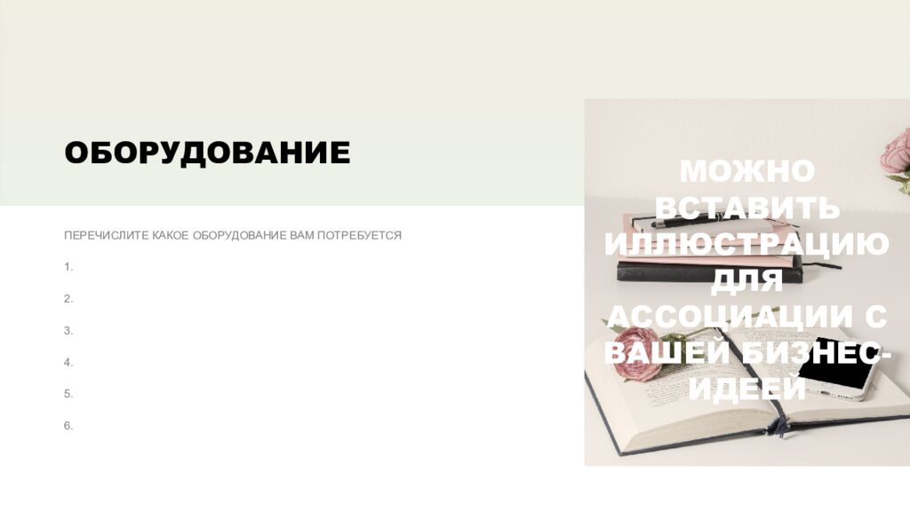 ПЕРЕЧИСЛИТЕ КАКОЕ ОБОРУДОВАНИЕ ВАМ ПОТРЕБУЕТСЯ 1. 2. 3. 4. 5. 6. ОБОРУДОВАНИЕ МОЖНО ВСТАВИТЬ ИЛЛЮСТРАЦИЮ ДЛЯ АССОЦИАЦИИ С ВАШЕЙ БИЗНЕС-ИДЕЕЙ