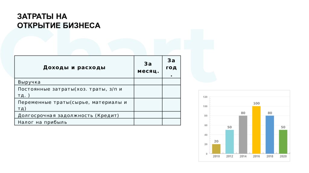ЗАТРАТЫ НА ОТКРЫТИЕ БИЗНЕСА Доходы и расходы За месяц. За год. Выручка Постоянные затраты(хоз. траты, з/п и тд. ) Переменные траты(сырье, материалы и тд) Долгосрочная задолжность (Кредит) Налог на прибыль