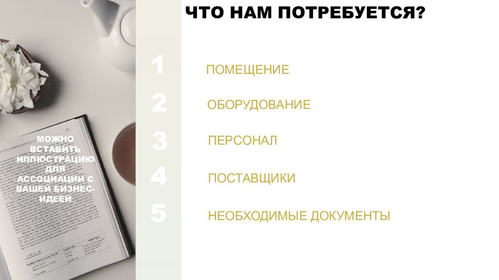 ПОМЕЩЕНИЕ ОБОРУДОВАНИЕ ПОСТАВЩИКИ ПЕРСОНАЛ 1 2 3 4 МОЖНО ВСТАВИТЬ ИЛЛЮСТРАЦИЮ ДЛЯ АССОЦИАЦИИ С ВАШЕЙ БИЗНЕС-ИДЕЕЙ ЧТО НАМ ПОТРЕБУЕТСЯ? 5 НЕОБХОДИМЫЕ ДОКУМЕНТЫ