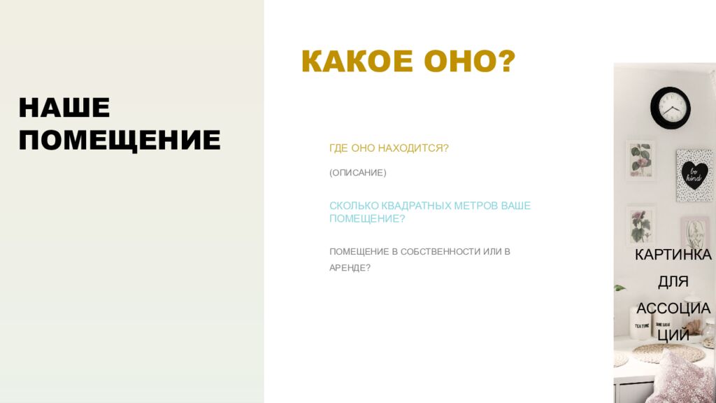 НАШЕ ПОМЕЩЕНИЕ (ОПИСАНИЕ) ГДЕ ОНО НАХОДИТСЯ? КАКОЕ ОНО? ПОМЕЩЕНИЕ В СОБСТВЕННОСТИ ИЛИ В АРЕНДЕ? СКОЛЬКО КВАДРАТНЫХ МЕТРОВ ВАШЕ ПОМЕЩЕНИЕ? КАРТИНКА ДЛЯ АССОЦИАЦИЙ