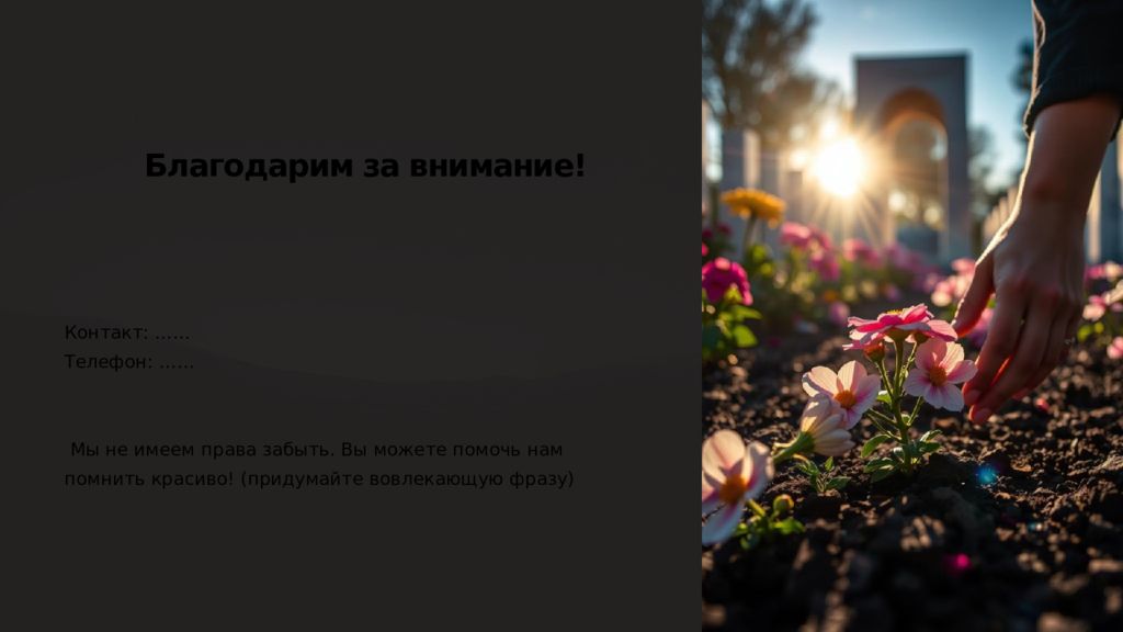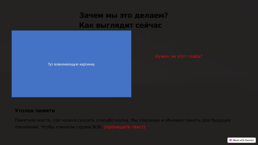 Зачем мы это делаем? Уголок памяти Памятное место, где можно сказать спасибо молча. Мы сохраним и обновим память для будущих поколений. Чтобы помнили героев ВОВ. (пропишите текст) Тут вовлекающую картинку Как выглядит сейчас Нужен ли этот слайд?