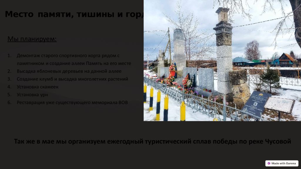 Место памяти, тишины и гордости Мы планируем : Демонтаж старого спортивного корта рядом с памятником и создание аллеи Память на его месте Высадка яблоневых деревьев на данной аллее Создание клумб и высадка многолетних растений Установка скамеек Установка урн Реставрация уже существующего мемориала ВОВ Так же в мае мы организуем ежегодный туристический сплав победы по реке Чусовой