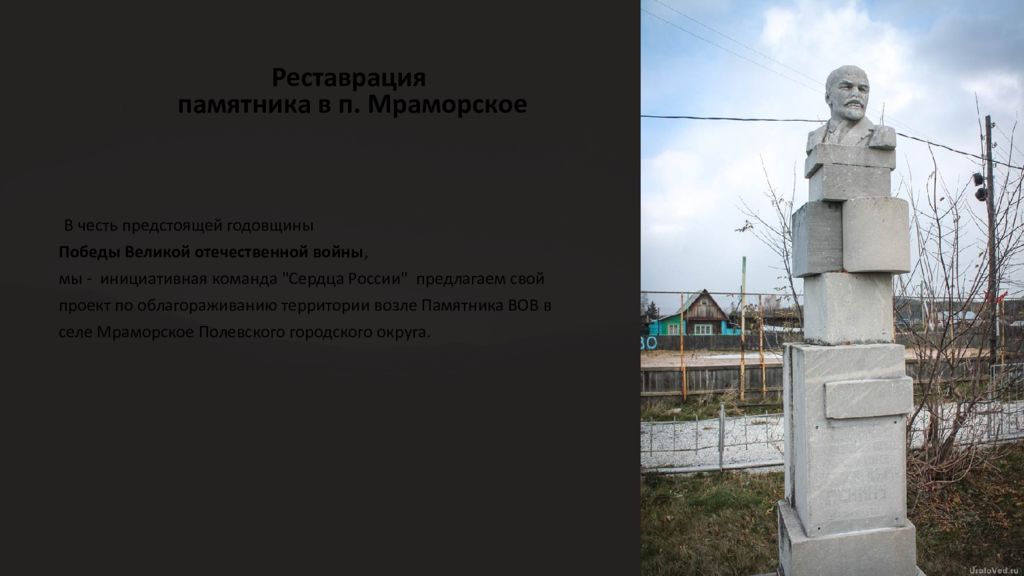 Реставрация памятника в п. Мраморское В честь предстоящей годовщины Победы Великой отечественной войны, мы - инициативная команда "Сердца России" предлагаем свой проект по облагораживанию территории возле Памятника ВОВ в селе Мраморское Полевского городского округа.