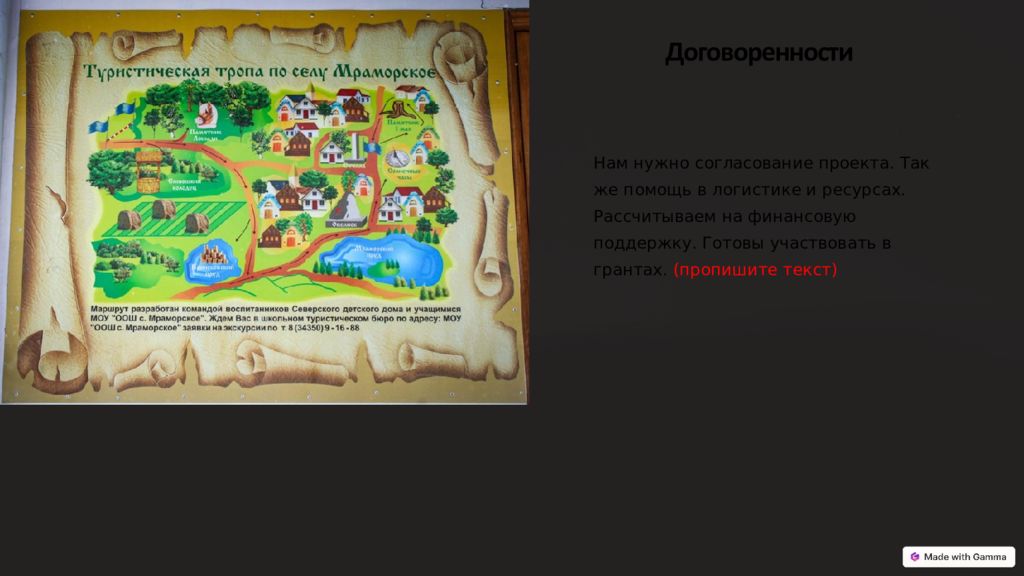 Договоренности Нам нужно согласование проекта. Так же помощь в логистике и ресурсах. Рассчитываем на финансовую поддержку. Готовы участвовать в грантах. (пропишите текст)