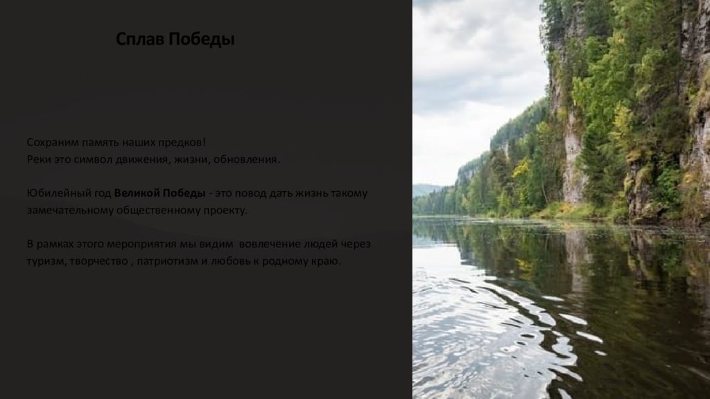 Сохраним память наших предков! Реки это символ движения, жизни, обновления. Юбилейный год Великой Победы - это повод дать жизнь такому замечательному общественному проекту. В рамках этого мероприятия мы видим вовлечение людей через туризм, творчество, патриотизм и любовь к родному краю. Сплав Победы