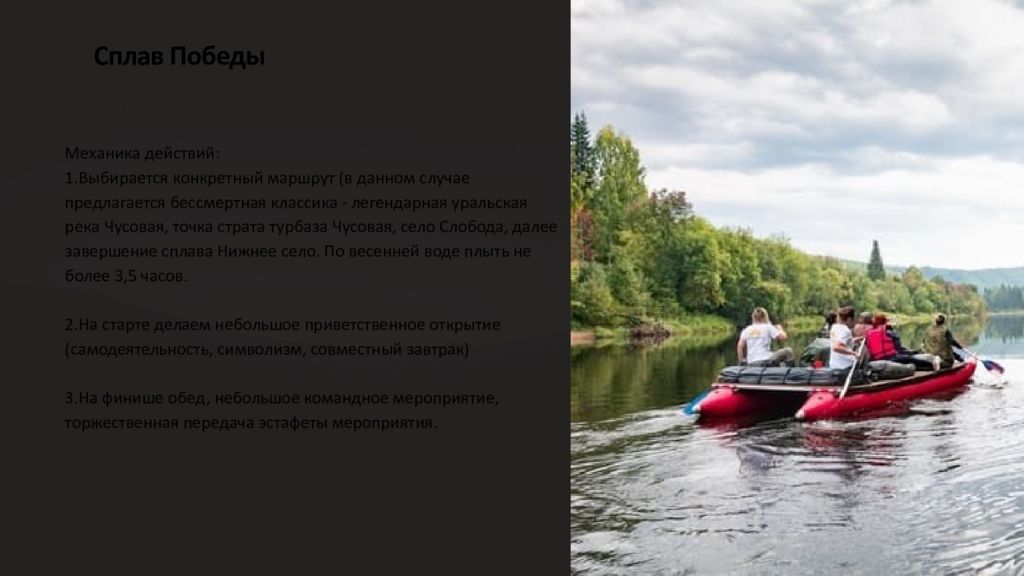 Сплав Победы Механика действий: 1.Выбирается конкретный маршрут (в данном случае предлагается бессмертная классика - легендарная уральская река Чусовая, точка страта турбаза Чусовая, село Слобода, далее завершение сплава Нижнее село. По весенней воде плыть не более 3,5 часов. 2.На старте делаем небольшое приветственное открытие (самодеятельность, символизм, совместный завтрак) 3.На финише обед, небольшое командное мероприятие, торжественная передача эстафеты мероприятия.