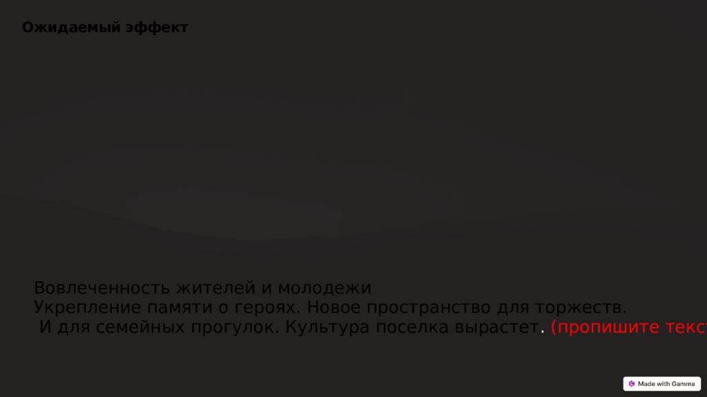 Ожидаемый эффект Вовлеченность жителей и молодежи . Укрепление памяти о героях. Новое пространство для торжеств. И для семейных прогулок. Культура поселка вырастет. (пропишите текст)