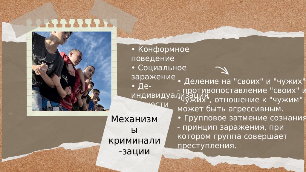 • Конформное поведение • Социальное заражение • Де-индивидуализация личности • Деление на "своих" и "чужих" - противопоставление "своих" и "чужих", отношение к "чужим" может быть агрессивным. • Групповое затмение сознания - принцип заражения, при котором группа совершает преступления. Механизмы криминали-зации