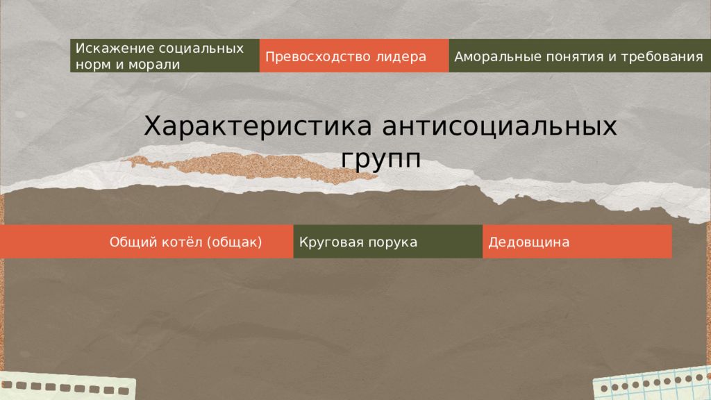 Превосходство лидера Аморальные понятия и требования Искажение социальных норм и морали Характеристика антисоциальных групп Общий котёл (общак) Дедовщина Круговая порука