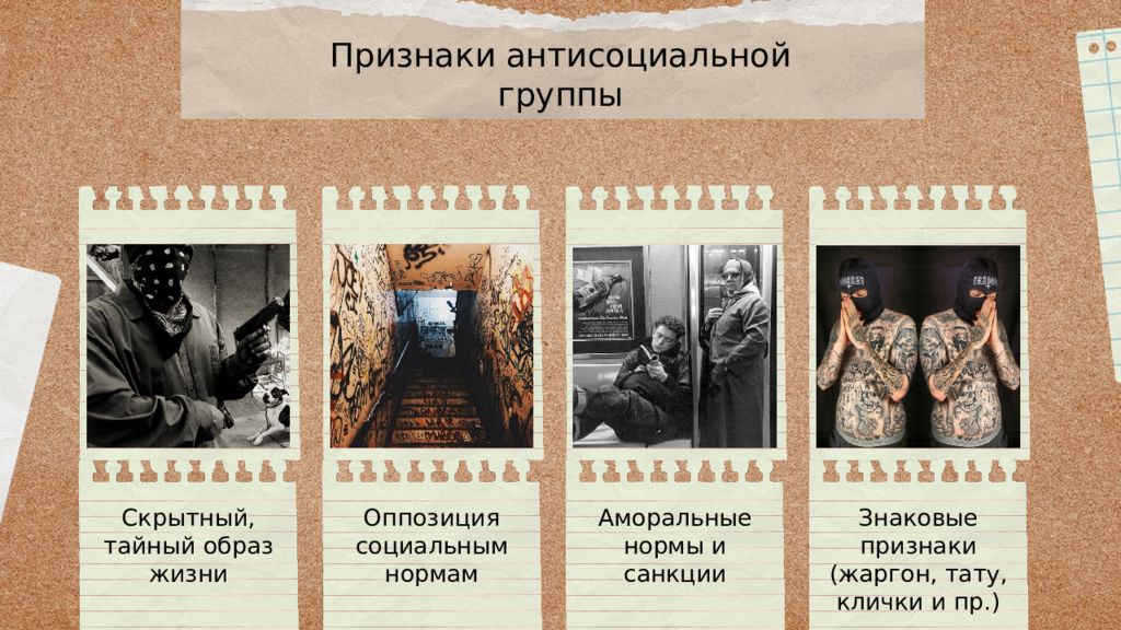 Признаки антисоциальной группы Скрытный, тайный образ жизни Оппозиция социальным нормам Аморальные нормы и санкции Знаковые признаки (жаргон, тату, клички и пр.)