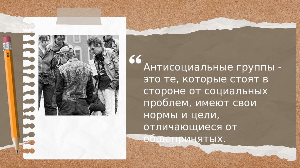 Антисоциальные группы - это те, которые стоят в стороне от социальных проблем, имеют свои нормы и цели, отличающиеся от общепринятых.