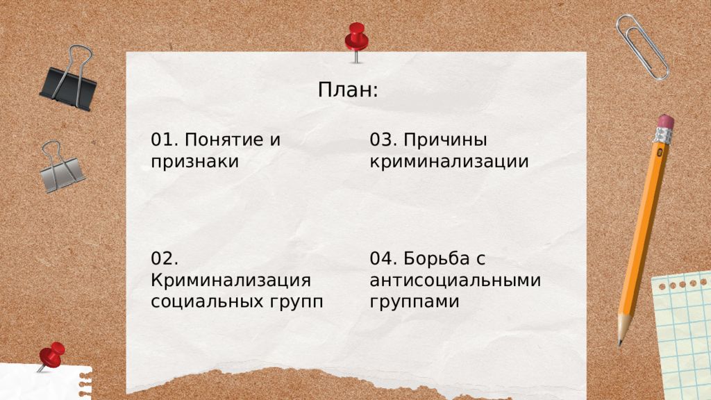 01. Понятие и признаки План: 03. Причины криминализации 02. Криминализация социальных групп 04. Борьба с антисоциальными группами