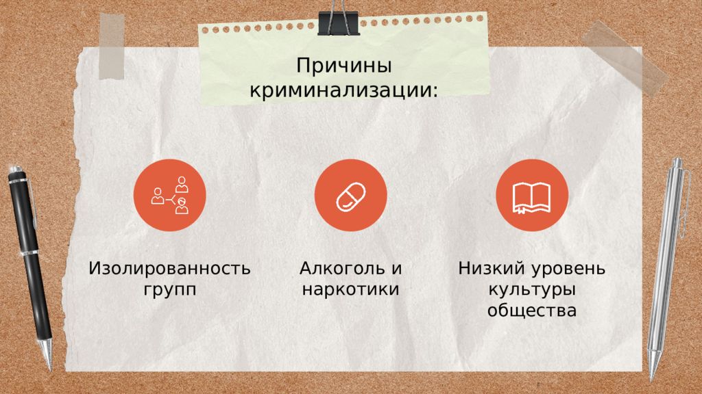 Алкоголь и наркотики Изолированность групп Низкий уровень культуры общества Причины криминализации: