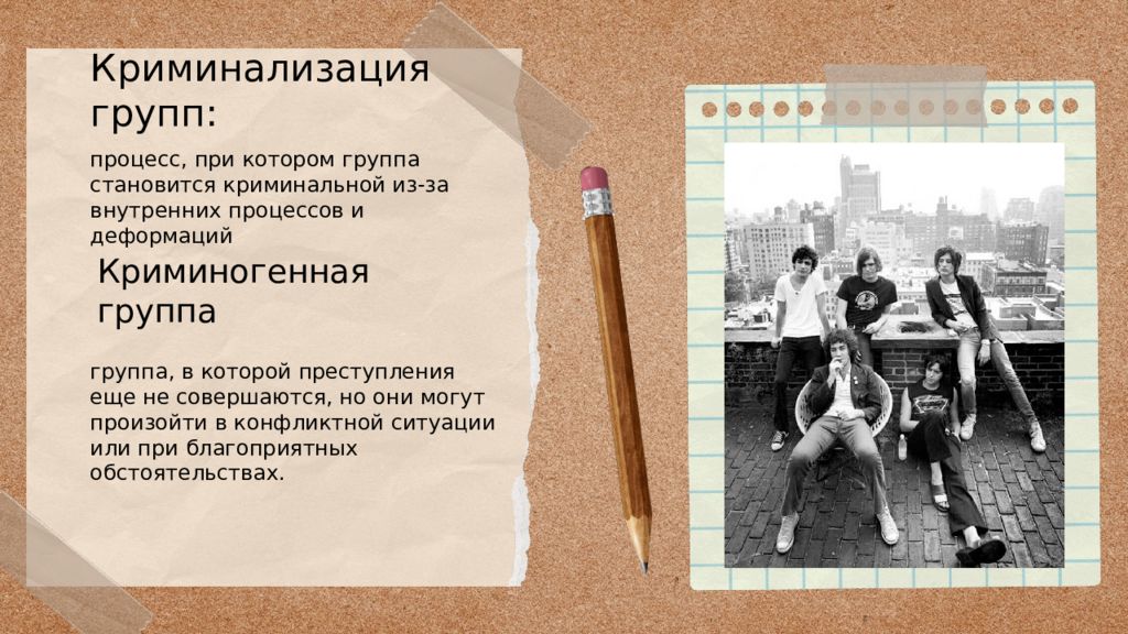 группа, в которой преступления еще не совершаются, но они могут произойти в конфликтной ситуации или при благоприятных обстоятельствах. Криминогенная группа Криминализация групп: процесс, при котором группа становится криминальной из-за внутренних процессов и деформаций