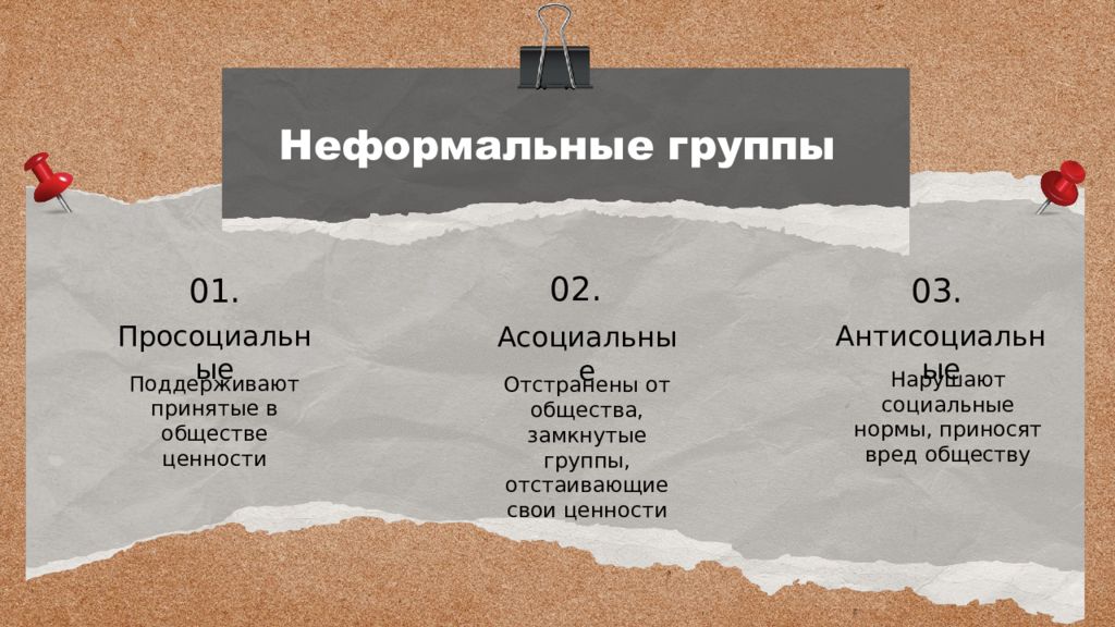 Неформальные группы Поддерживают принятые в обществе ценности Просоциальные 01. Отстранены от общества, замкнутые группы, отстаивающие свои ценности Асоциальные 02. Нарушают социальные нормы, приносят вред обществу Антисоциальные 03.