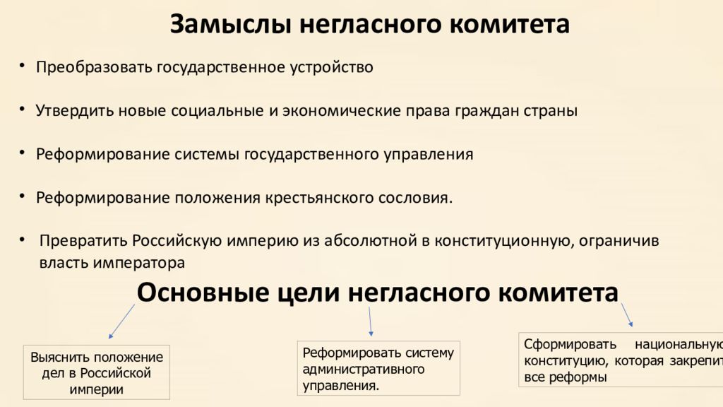 Замыслы негласного комитета Преобразовать государственное устройство Утвердить новые социальные и экономические права граждан страны Реформирование системы государственного управления Реформирование положения крестьянского сословия. Превратить Российскую империю из абсолютной в конституционную, ограничив власть императора Основные цели негласного комитета Выяснить положение дел в Российской империи Реформировать систему административного управления. Сформировать национальную конституцию, которая закрепит все реформы