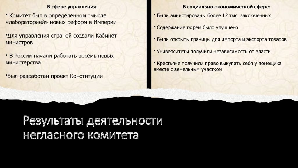 Результаты деятельности негласного комитета В сфере управления: В социально-экономической сфере: Комитет был в определенном смысле « лабораторией » новых реформ в Империи Для управления страной создали Кабинет министров В России начали работать восемь новых министерства Был разработан проект Конституции Были амнистированы более 12 тыс. заключенных Содержание тюрем было улучшено Были открыты границы для импорта и экспорта товаров Университеты получили независимость от власти Крестьяне получили право выкупать себя у помещика вместе с земельным участком