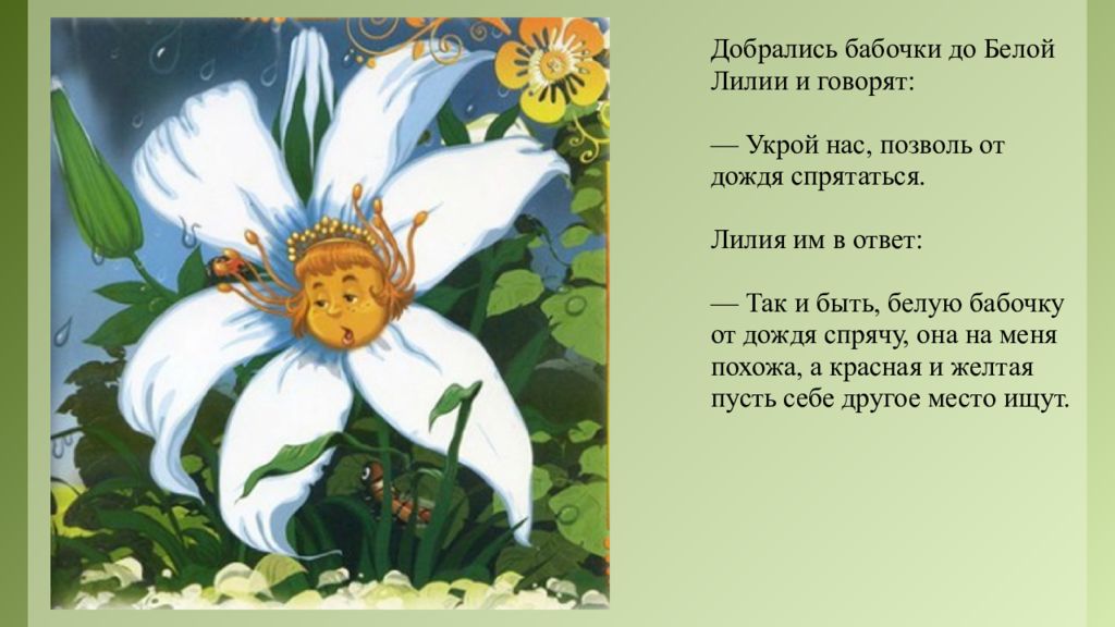Добрались бабочки до Белой Лилии и говорят: — Укрой нас, позволь от дождя спрятаться. Лилия им в ответ: — Так и быть, белую бабочку от дождя спрячу, она на меня похожа, а красная и желтая пусть себе другое место ищут.