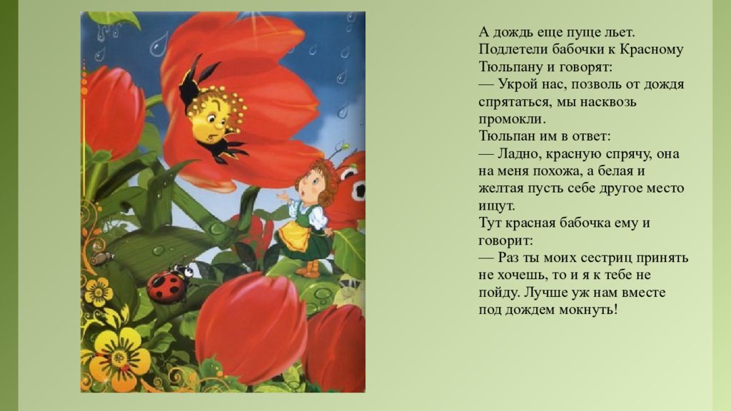 А дождь еще пуще льет. Подлетели бабочки к Красному Тюльпану и говорят : — Укрой нас, позволь от дождя спрятаться, мы насквозь промокли. Тюльпан им в ответ : — Ладно, красную спрячу, она на меня похожа, а белая и желтая пусть себе другое место ищут. Тут красная бабочка ему и говорит : — Раз ты моих сестриц принять не хочешь, то и я к тебе не пойду. Лучше уж нам вместе под дождем мокнуть !