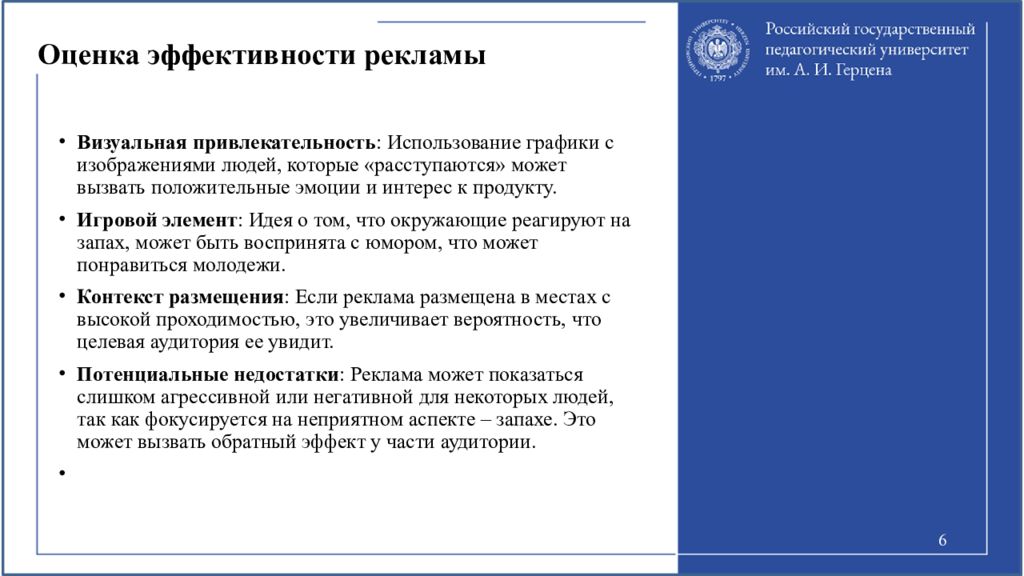 6 Визуальная привлекательность : Использование графики с изображениями людей, которые «расступаются» может вызвать положительные эмоции и интерес к продукту. Игровой элемент : Идея о том, что окружающие реагируют на запах, может быть воспринята с юмором, что может понравиться молодежи. Контекст размещения : Если реклама размещена в местах с высокой проходимостью, это увеличивает вероятность, что целевая аудитория ее увидит. Потенциальные недостатки : Реклама может показаться слишком агрессивной или негативной для некоторых людей, так как фокусируется на неприятном аспекте – запахе. Это может вызвать обратный эффект у части аудитории.