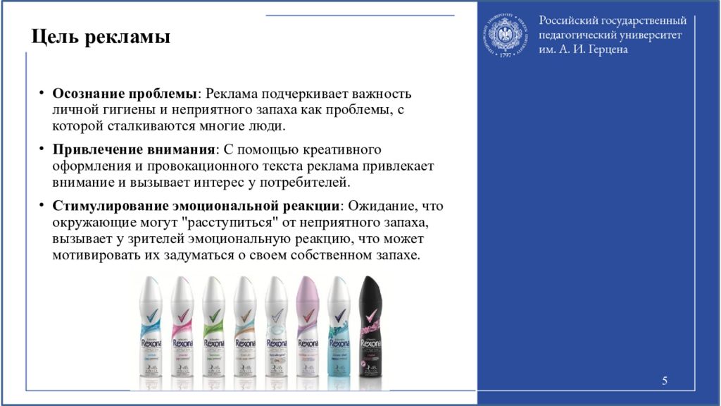 5 Осознание проблемы : Реклама подчеркивает важность личной гигиены и неприятного запаха как проблемы, с которой сталкиваются многие люди. Привлечение внимания : С помощью креативного оформления и провокационного текста реклама привлекает внимание и вызывает интерес у потребителей. Стимулирование эмоциональной реакции : Ожидание, что окружающие могут "расступиться" от неприятного запаха, вызывает у зрителей эмоциональную реакцию, что может мотивировать их задуматься о своем собственном запахе.